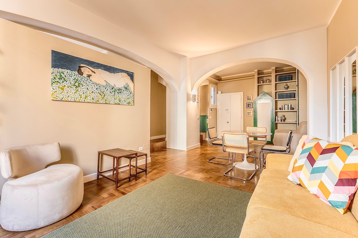 Abre una llamativa puerta de cobre para revelar una espaciosa sala de estar con suelos de madera clara y un sofá azul polvo bañado por la luz natural. Los techos altos, los detalles limpios y las piezas de diseño discretas le dan a este apartamento su brillo suave y su reticencia elegante. El apartamento se compone de una gran sala de estar que se puede transformar en un segundo dormitorio con un cómodo sofá cama (colchón de 18 cm de grosor), un comedor/sala de relajación con una bonita cocina y un dormitorio principal, el baño tiene una ducha espaciosa. Al entrar en el apartamento, encontrarás el gran salón dividido por una estantería abierta y un gran sofá cama que se transforma en una cómoda cama tamaño queen. Más adelante encontrarás el comedor con una cocina abierta y un rincón de lectura, al final el dormitorio principal con una cama tamaño queen y un baño con ducha. La sala de estar se puede separar del comedor gracias a una puerta corredera hecha a medida que la transforma en un segundo dormitorio por la noche. La cocina totalmente equipada cuenta con cocina de gas, horno, nevera, congelador, lavavajillas y todos los cubiertos y vajilla necesarios. El apartamento cuenta con todas las comodidades: internet wifi de alta velocidad, aire acondicionado y un lavavajillas en la cocina. Tendrás acceso a Netflix y Amazon Prime Video. En el momento del registro, te sugeriré los mejores restaurantes frecuentados por los lugareños y cosas interesantes que hacer en Roma. Trastevere es uno de los barrios más bonitos de Roma, con sus estrechas calles empedradas, coloridos edificios repletos de hiedra y balcones animados con geranios. Trastevere es relajado y tiene mucho menos tráfico que otras partes de la caótica Roma. Parece más un pequeño pueblo que una gran ciudad.