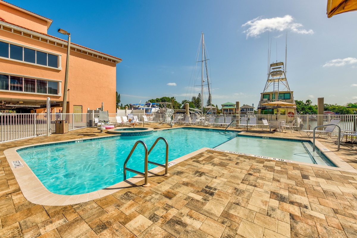 ¡Este alojamiento está completamente actualizado y es moderno! ¡Disfruta de una vista MAGNÍFICA desde el balcón privado de 20' con vistas a la bahía, la piscina y el jacuzzi! ¡Mira a los delfines todas las mañanas mientras tomas tu café o mientras disfrutas de una copa de vino por la noche! A 6 minutos en auto de Madeira Beach y cerca de todos los servicios con muchos restaurantes cerca, incluido Doc Ford's al lado, y tiendas a 7 minutos. Hay mucho que hacer; cerca de la pesca, incluyendo aguas profundas y moto acuática. 1 dormitorio, capacidad para 4 personas; cómodo sofá cama.