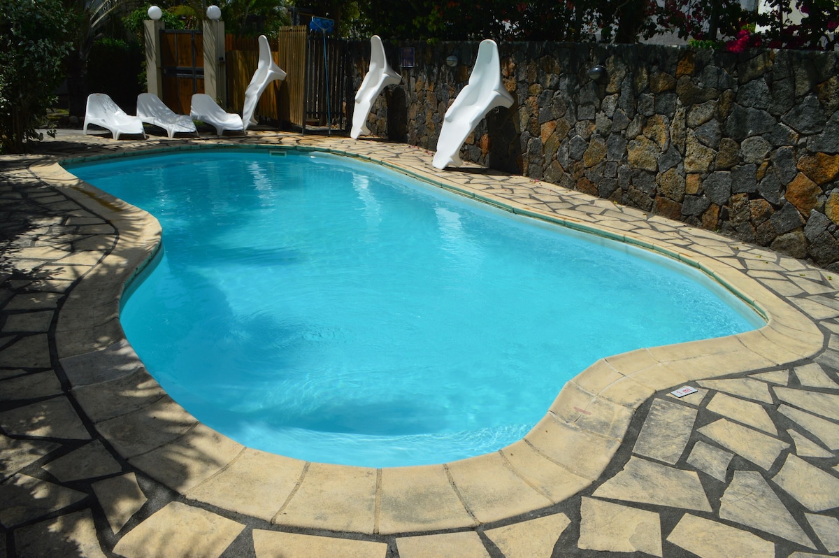 Situated in Baie Du Tombeau 15 minutes from Port Louis, the capital, and 30 minutes from the touristic north. Large one bedroom apartment (90m2) + 2 sofabeds in the lounge. Swimming pool & beautiful garden, wifi, chrome cast included.