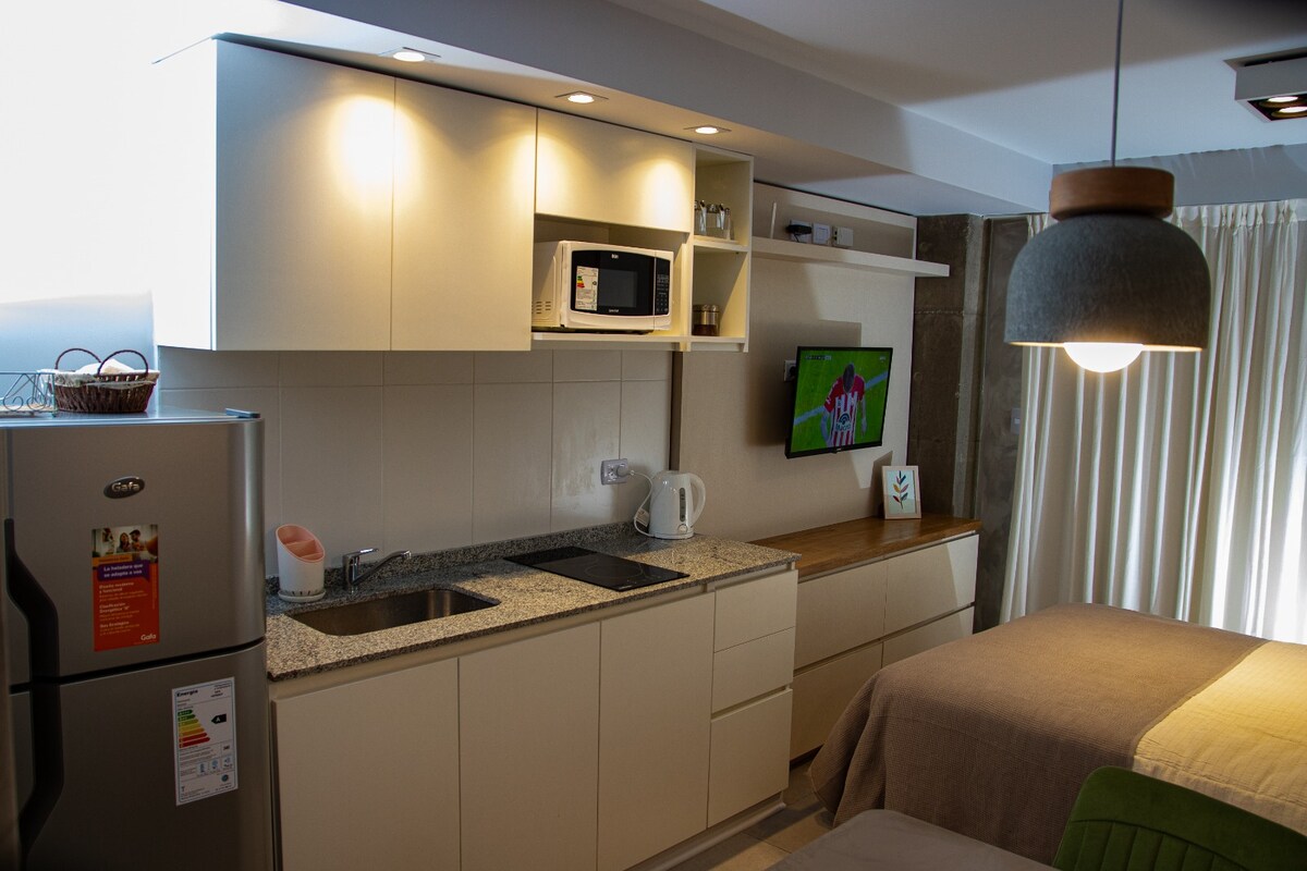Cálido y completo monoambiente premium a estrenar ubicado en la mejor zona de San Miguel de Tucumán ( Barrio Norte) . Se trata de un espacio único con todas sus instalaciones y equipamientos nuevos y una decoración de primer nivel que hará de su estadía una experiencia muy confortable. Contará con vajilla completa, cocina eléctrica, microondas, pava eléctrica, aire acondicionado, insumos para el desayuno, ropa de cama, toallas de baño y de mano, TV Smart 21 pulgadas, entre otras comodidades.