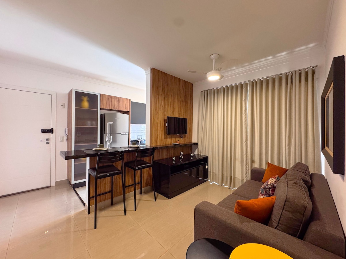 ¡Loft único en la ciudad! Balcón gourmet cerrado y con aire acondicionado, ¡con mesa y sillas para que disfrutes de esa barbacoa! Dormitorio con cama tamaño queen con ambiente de sala de estar separado manteniendo tu privacidad. Sala de estar con sofá cama, TV inteligente y aire acondicionado. Cocina completa para la preparación de tus comidas. Cama completa y baño Enxoval. Plaza de garaje doble. ¡Ven y siéntete en casa!