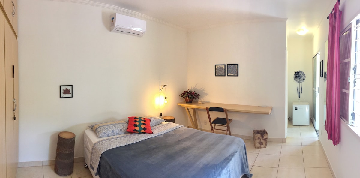 Quarto aconchegante com pátio