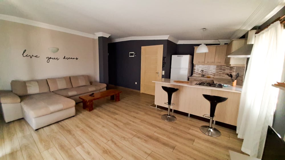 Un espacioso apartamento de un dormitorio con capacidad para 2-4 adultos. Este apartamento con aire acondicionado se abre a un balcón y cuenta con TV de pantalla plana y zona de cocina con placas de cocina y mesa de comedor. Hay conexión wifi gratuita y estacionamiento disponibles.