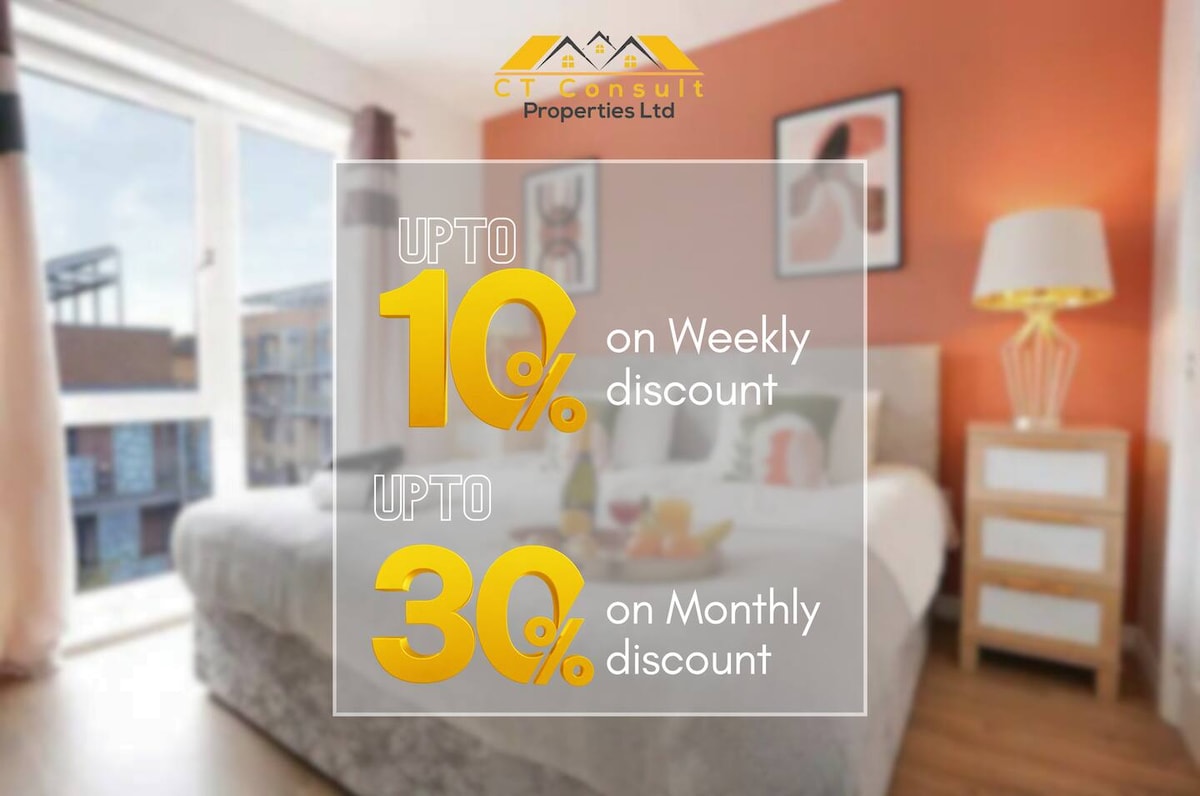 ROOFTOPs es un luminoso apartamento con servicios en la ubicación perfecta para cualquier persona que visite Milton Keynes/Bletchley. El amplio salón/comedor es ideal para relajarse o socializar. Netflix y wifi gratuitos incluidos. Se suministran toallas, champú, etc. El dormitorio tiene armarios empotrados y una cómoda cama tamaño súper king con muelles ensacados. Si se alojan tres personas, hay un sofá cama en el salón. El registro de entrada autónomo está disponible. Ten en cuenta que hay una cámara de seguridad fuera de la puerta principal.