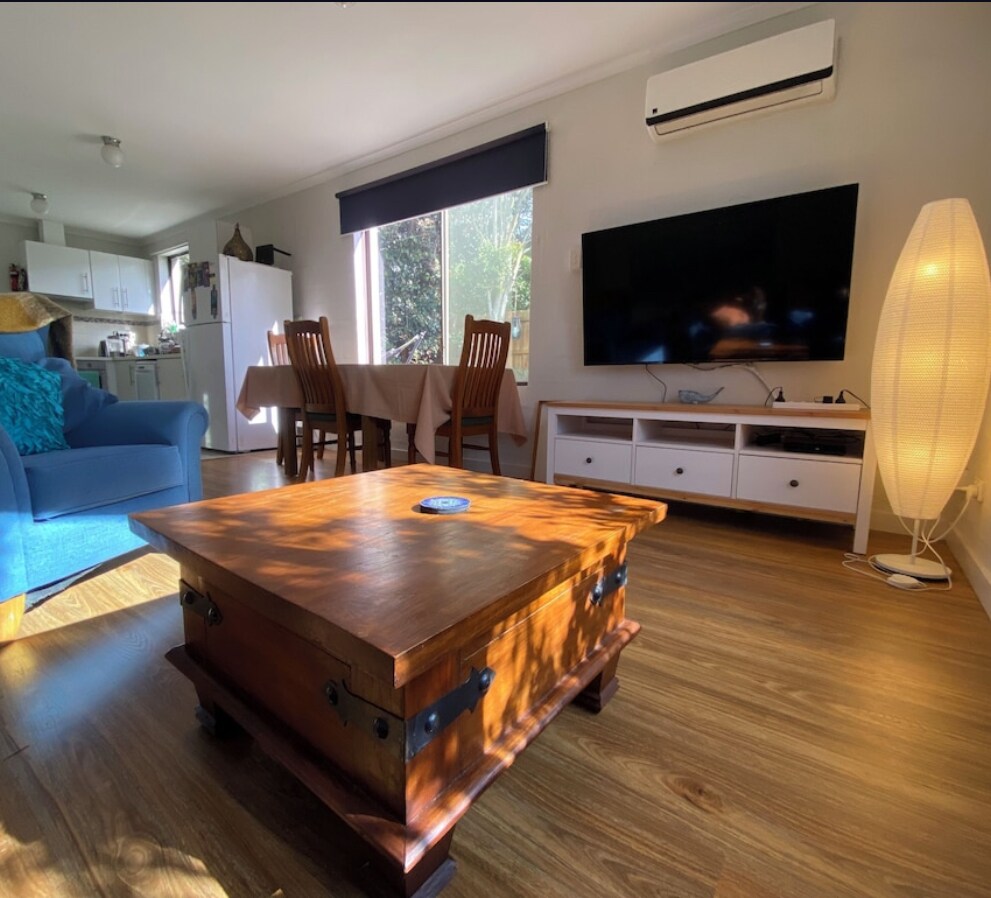 Warneet Retreat es un pequeño y acogedor hogar lejos de casa. Es ideal para parejas o solteros. Tiene una cama tamaño queen. ¡Se admiten perros que se porten bien! Está separada de la casa principal y tiene puertas delanteras y traseras, una terraza vallada y zona de barbacoa. Hay secador de pelo, plancha y tabla de planchar. La cocina tiene una nevera grande, placa eléctrica y horno microondas. Relájate frente al televisor de 50 pulgadas, mira Netflix o juega a un juego. El retiro se calienta y se enfría mediante un sistema dividido.