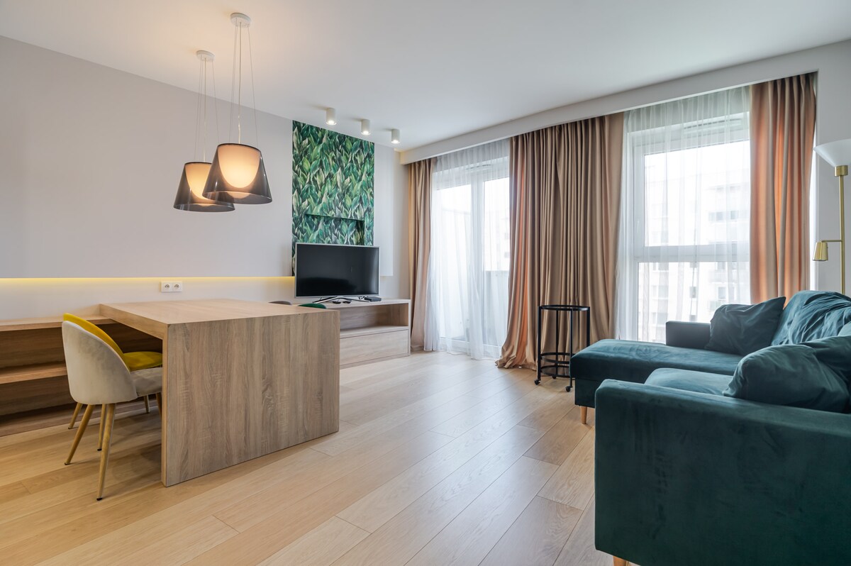 Two-room comfortable, air-conditioned apartment (45 m2) designed by an architectural firm in a modern boho style 🏡 - Bedroom with a double bed & designated workspace - Living room with a double sofa - Kitchenette with all the essentials including coffee machine & milk frother so that you can have your morning cappuccino - Bathroom with a shower, bidet, washing & drying machine and all the bath essentials - Balcony - 600 Mb/s Wi-Fi - Free parking space in the underground garage
