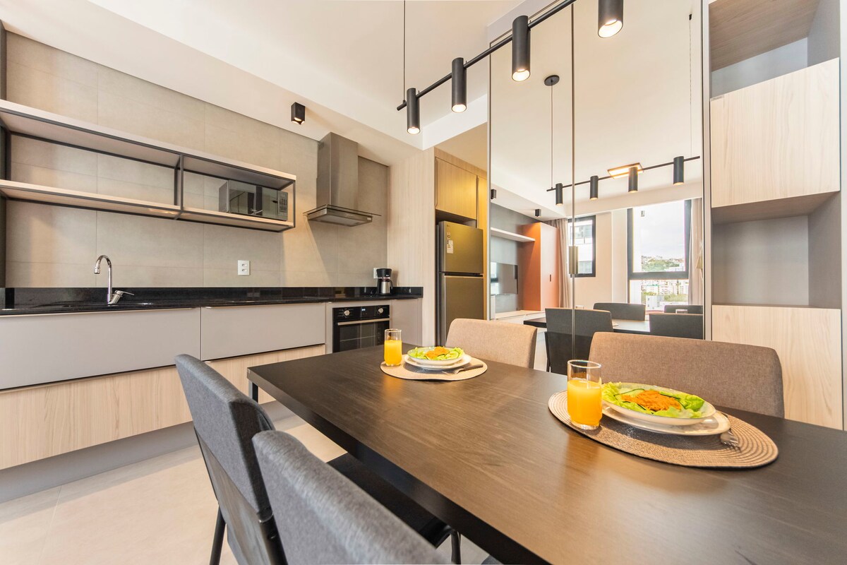 Studio.b2b – Comodidad, estilo y ubicación perfecta en la isla de la magia en Florianópolis Alójate en un estudio moderno y completo, ideal para un máximo de 6 huéspedes o 3 parejas. El condominio tiene: - Centro multifuncional (Food Hall). - Angeloni (supermercado y tiendas - planta baja) - Centro gastronómico - 1.º piso (C1) - Situado frente al Hospital Universitario, UFSC y a pocos metros del centro comercial Villa Romana. - El estudio es ideal para parejas, estudiantes, profesionales, “nómadas digitales”.