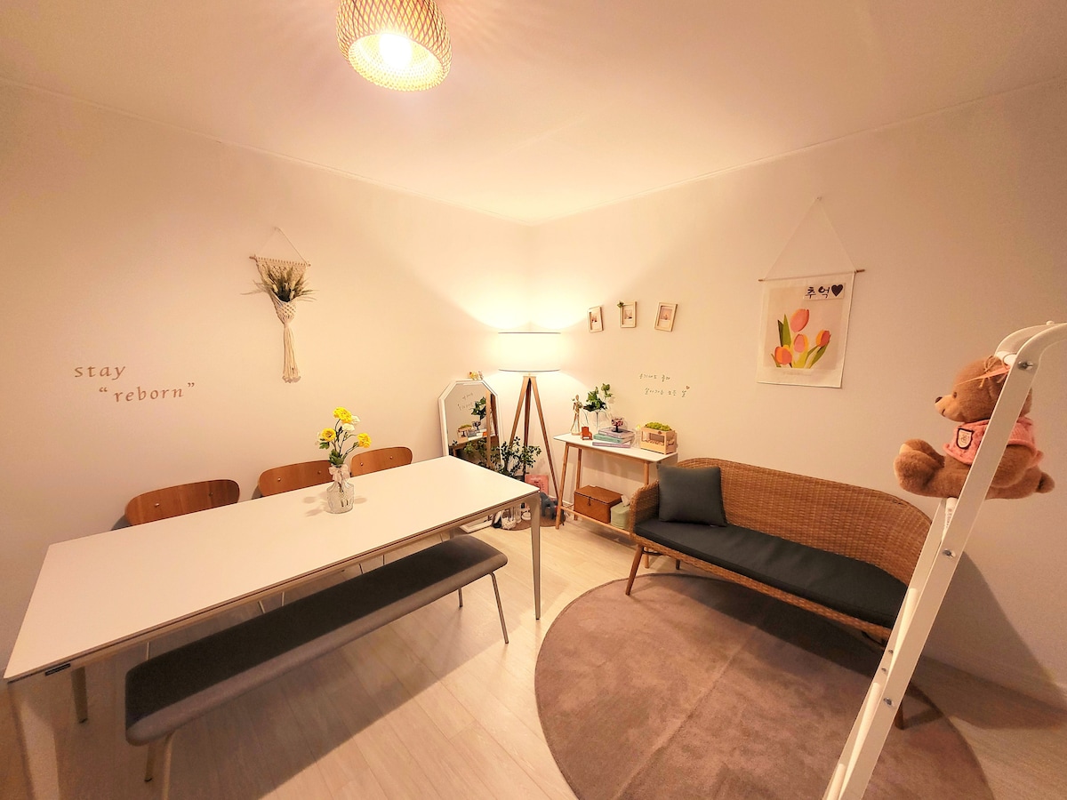 Ulsan Accommodation Stay Ribbon ~🎀 🤗 stay "reborn" es un espacio agradable y cálido con un interior blanco de madera, un lugar espacioso y acogedor para alojarse con familiares/amigos/amantes, y está ubicado en el segundo piso de una escalera baja. 2 dormitorios, 3 camas tamaño queen, 1 baño, capacidad para 6 personas, 🚙Hay aparcamiento en la calle en un callejón residencial detrás del edificio. Sin embargo, el 1 y el 6, el mercado tradicional está abierto, así que una cuadra Utiliza la zona residencial superior o al otro lado de la carretera (hay estacionamiento disponible en la carretera principal los días de mercado; muévete al callejón por la noche cuando el mercado esté cerrado). Este es un alojamiento donde puedes experimentar el mercado tradicional justo a la salida de la entrada en el primer piso del alojamiento. 🤗 Ubicación * A 10 minutos en coche de Ulsan IC. * Jardín nacional del río Taehwa a 8 minutos en coche. * Ulsan Innovation City a 10 minutos en coche. * Complejo de alimentos forestales de Sibnidae (Más de 130 restaurantes) a 5 minutos en coche. * A 2 minutos a pie de la parada de autobús. * A 13 minutos a pie de la estación KTX Ulsan en autobús. * A 3 minutos a pie de tiendas de comestibles y tiendas de conveniencia. * A 10 minutos en coche del Wild Flower Learning Center, Ivhwasan Natural Recreation Forest. * Playa Gangdong Mondol, mar de Ilsanji, parque Daewangam * Museo de la Ballena Jangsaengpo a 25 minutos en coche. 🤗 Horario del alojamiento * Hora del check-in: 16:00 * Hora de salida: 11:00