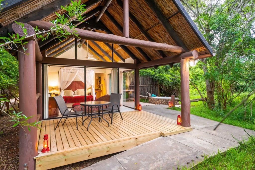 The Lodge is situated between magnificent fever trees on the banks of the Msunduze River below the Lebombo Mountains. It offers its guests a wonderful spot to relax and unwind, listening to the prolific birdlife, watching African wildlife such as Nyala, Kudu, Impala from the doorstep of your luxurious individual chalets. Occasionally Lions and Elephant visit across the fence in the dry river bed in front of the lodge.Enjoy scrumptious Breakfasts, and Boma Dinners, chilled wine under the stars.