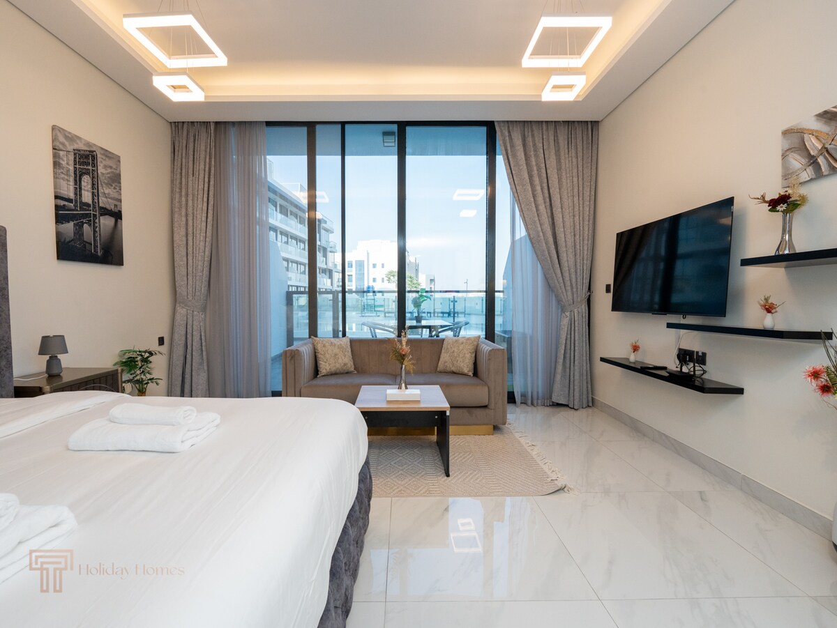 Spacious 1-BR ground-floor apt with a private garden in MBR City, minutes from Downtown Dubai. Sleeps 3 ( 2 Adult 1 child ) Baby crib can arrange for an additional charge on request. Features a king bed, fully equipped kitchen, Smart TV & Wi-Fi. Enjoy free parking, 24/7 security & self-check-in. Access community parks, jogging tracks & sports courts. ! PLEASE NOTE: The Crystal Lagoon is temporarily closed for maintenance. Message us for recent photos. All bills included.