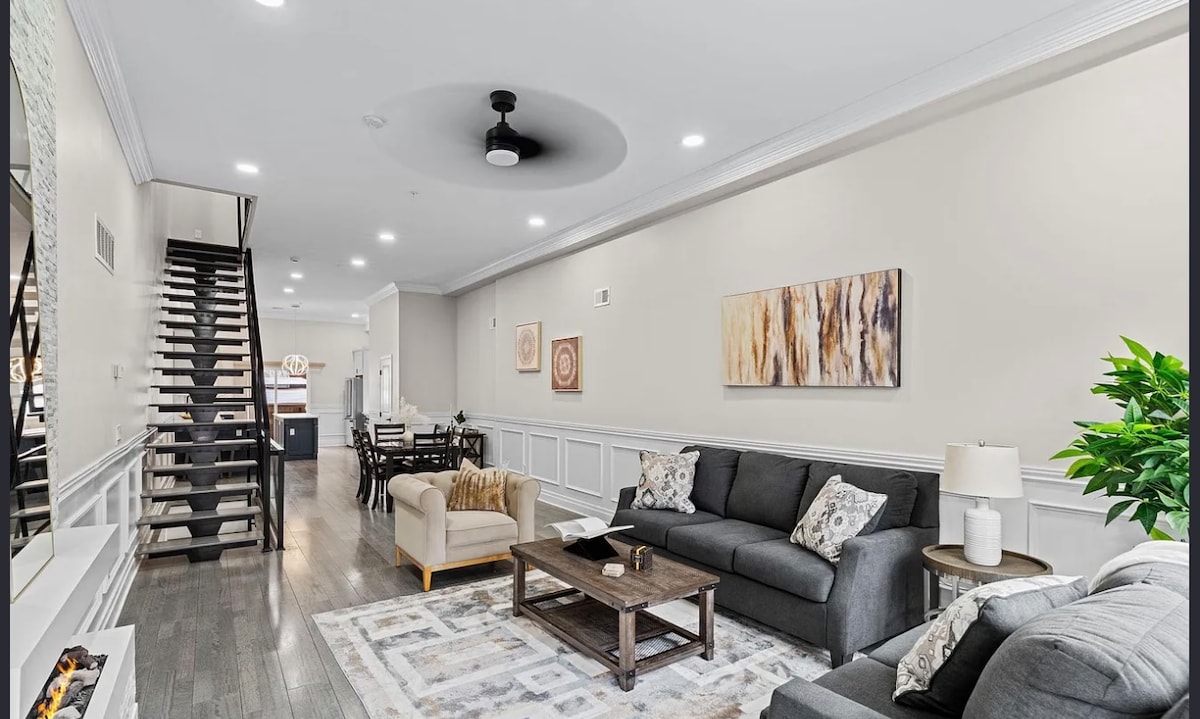 ¡La bañera de hidromasaje está abierta! Disfruta de nuestra casa en el centro de la ciudad con una gran terraza privada en la azotea, bañera de hidromasaje, fogata y estacionamiento privado en el garaje. La amplia casa muestra una gran habitación con techos de 20 pies y un televisor de pantalla plana de 85 pulgadas. Casa de lujo. Perfecto para grupos grandes. A pocos pasos del Centro de Convenciones de Filadelfia y del Mercado de la Terminal de Lectura. La casa ofrece una cocina moderna y una suite principal. A 5 minutos de Love Park, Independence Hall, Liberty Bell y Museum District.