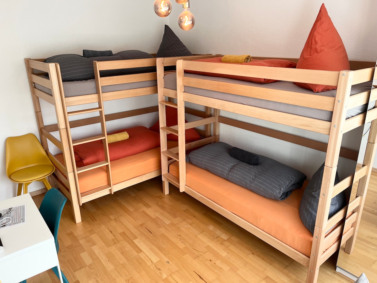 El departamento se renueva regularmente. Los muebles de roble y materiales naturales para una buena conciencia y la alegría de la comodidad te dan el marco para una estancia relajante. Tienes tu propia entrada y puedes desayunar o asar en tu propia terraza cuando el clima lo permita. Por supuesto, tenemos una cocina totalmente equipada con microondas y cafetera Nespresso. La televisión es obligatoria y para las personas analógicas entre ustedes, una biblioteca está a su disposición.
