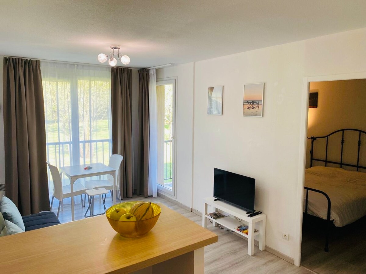 estudio de 21 m2 totalmente renovado ( 2021) para 3 personas situado en el 1er piso de una residencia de turismo*** en Equemauville( 3 km de Honfleur) donde encontrará todas las tiendas de proximidad accesibles a pie . Los autobuses al pie de la residencia pueden llevarle a Honfleur . En este estudio tendrá a su disposición: cocina equipada (microondas grill, Tassimo, tostadora, hervidor, placas de inducción), habitación principal: smart TV 4K, cama doble, sofá cama de 1 plaza.