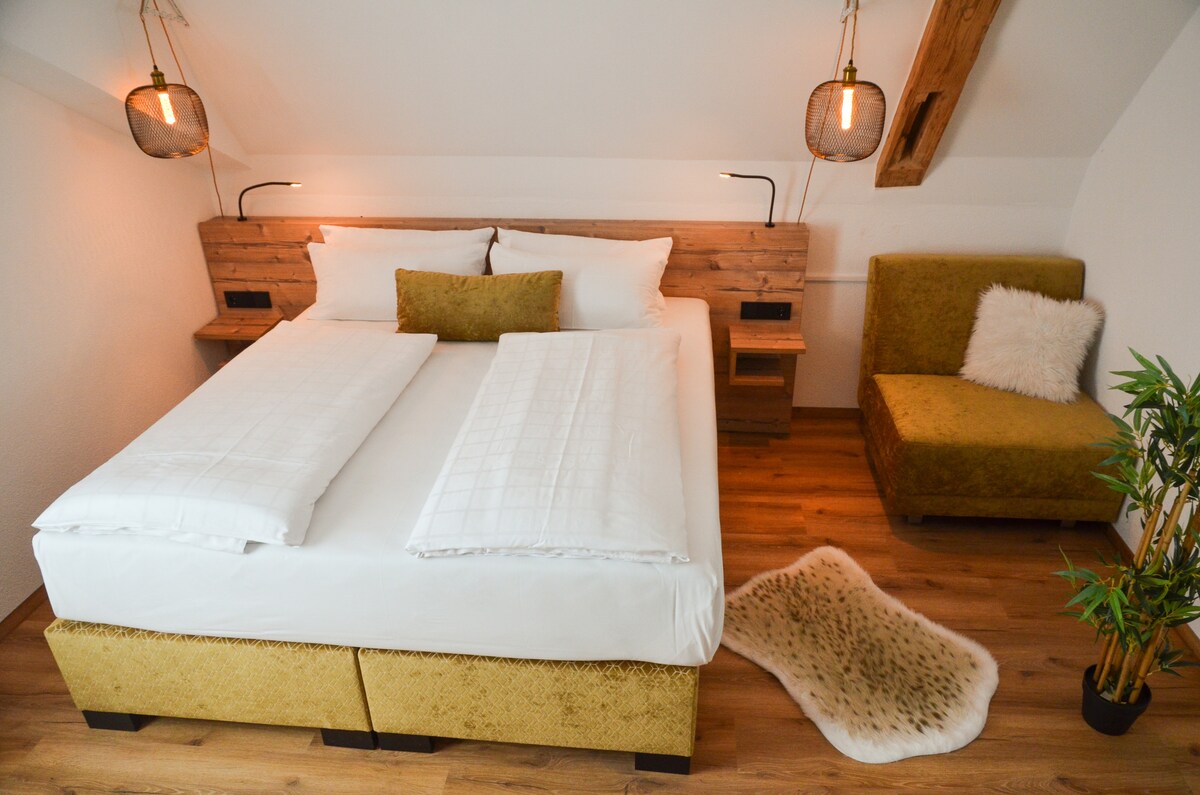Compacto, tranquilo y elegante. Nuestras encantadoras habitaciones en el ático ofrecen aproximadamente 18 m² de comodidad inteligentemente diseñada. Luminosas y recientemente renovadas, cuentan con techos inclinados y dan al tranquilo patio o a la Schulgasse, algunas con vistas a la torre Mehlsack o Veitsburg. Cada habitación incluye una cama tamaño queen de 1,60 m, TV de pantalla plana de 42", escritorio, sillón, suelo con efecto roble oscuro e iluminación LED indirecta. El moderno baño está equipado con una ducha de vidrio, espejo cosmético,