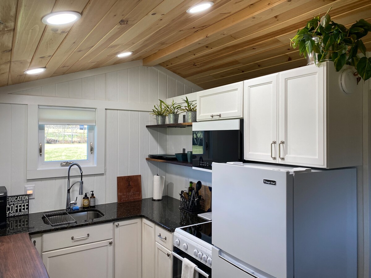 ¡Vida en una casa diminuta! La casa diminuta incluye una cama doble, TV de pantalla plana de 50 pulgadas, nevera pequeña, microondas, cafetera, baño diminuto completo con ducha y rincón de lectura en el loft. En el exterior encontrarás 6 acres para pasear, un jacuzzi para dos personas, una parrilla de carbón, un pozo de fuego y una pequeña cascada con un porche. La casita Lil Red Tiny House se encuentra a unos 30 pies detrás de otra casa que no está ocupada actualmente. Nota: Las cámaras exteriores pueden grabar.