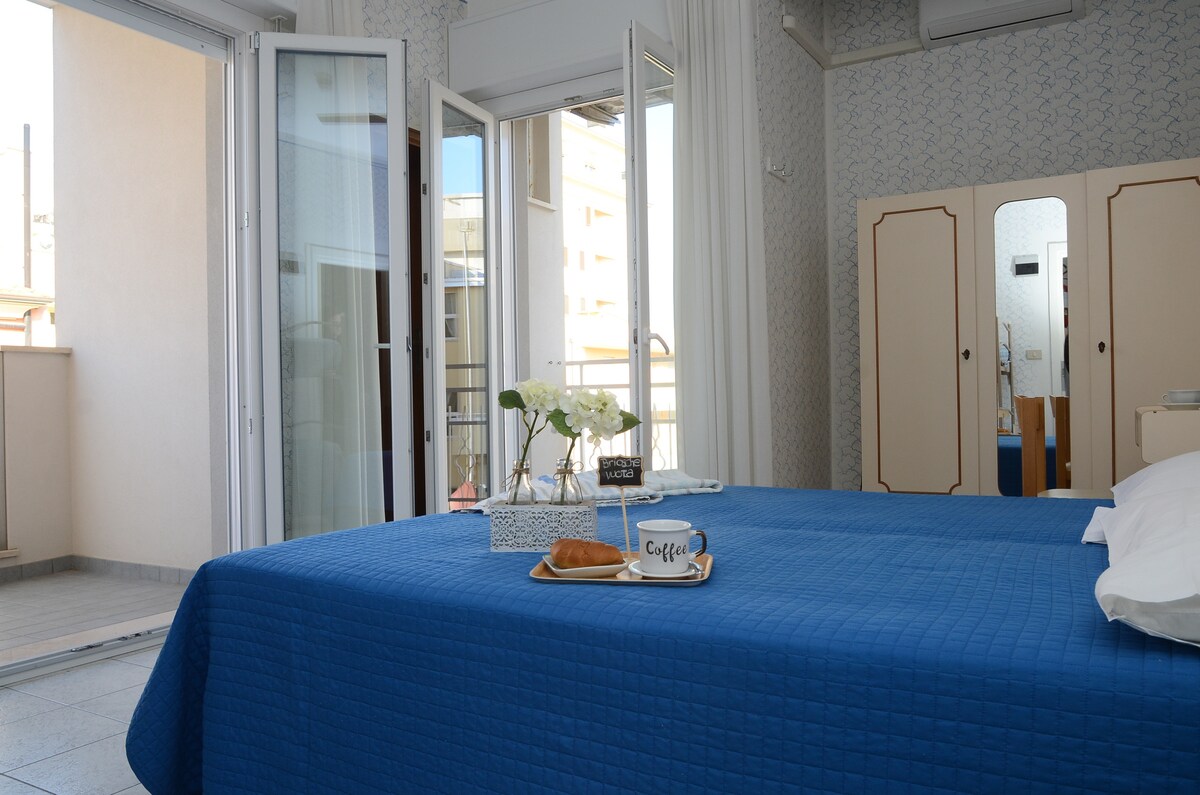 La habitación doble ofrece una cama doble o dos camas individuales. Equipado con aire acondicionado, TV, baño privado con ducha, secador de pelo, caja fuerte y balcón francés.