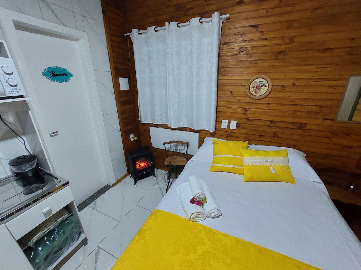 Chalé independiente. Suite con aire acondicionado inverter frío y calor, Wi-Fi, smart tv, balcón, mini cocina, minibar, cafetera dolce gusto, sandwichera, hervidor eléctrico, ducha a gas y utensilios básicos. Disponemos de una cama queen supercómoda, con ropa de cama Altemburg. Almohadas Plumi de Altemburg. Hay un total de 2 chalets completamente independientes. El lugar es ideal para aquellos que quieren estar en el centro de Urubici. Seguimos los protocolos de limpieza y desinfección.