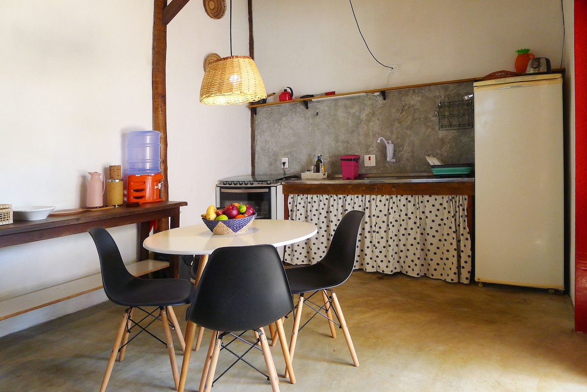Todo lo que realmente necesitas. Nada que no necesites. Chalet espacioso en Serra Grande con lo esencial bien hecho: cocina equipada, internet de calidad, balcón con hamaca, terraza de madera, ducha al aire libre, estacionamiento. Rodeado de bosque. Tranquilo por naturaleza. Inteligentemente posicionado. A 3 km: playa paradisíaca cuando quieras agua salada. A 1 km: pueblo con restaurantes cuando quieras vida cultural. Serra Grande en su máxima expresión: simple, completo, verdadero.