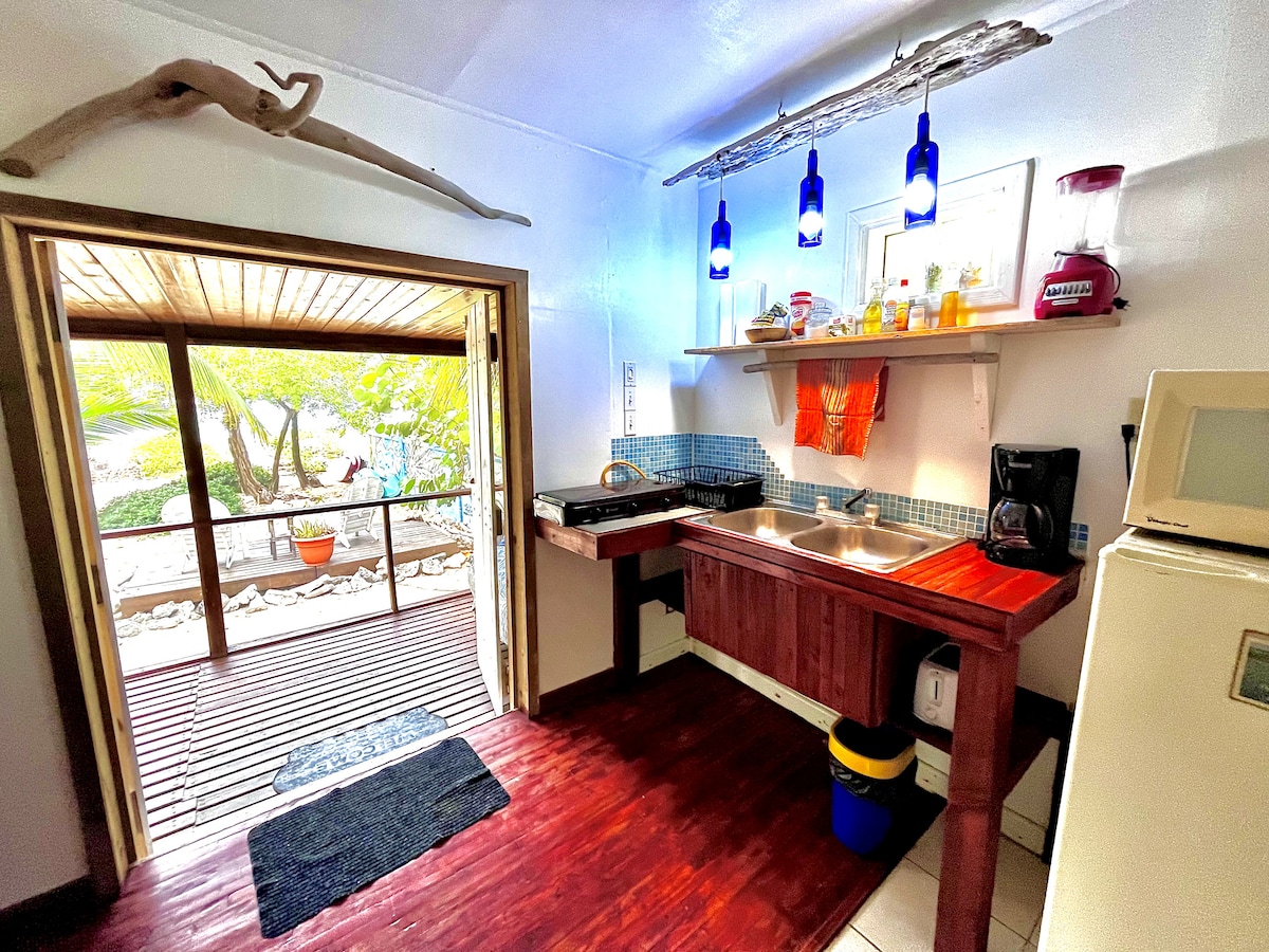 The Beach Casita is part of the Paradise Regained properties and is a rustic, self-contained oceanfront retreat with views of the Caribbean ocean, access to the Paradise Regained oceanfront and some of Utila's best reefs, excellent snorkeling and a saltwater swimming pool. With beach chairs available and our beach gazebo with hammocks and Adirondack rocking chairs, you might not want to leave. But if you do, it's just a 15 minute walk to the center of town.
