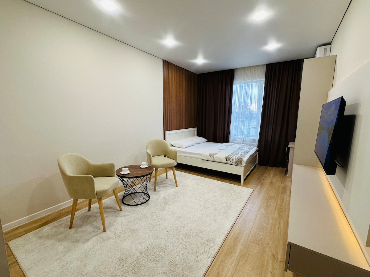 Hermoso departamento tipo estudio. Ubicación única con un encantador balcón aislado con vistas a la montaña. ¡Esta suite ofrece todo para tu estancia en Tashkent! Situado cerca de la mezquita menor a lo largo del río Anhor, un barrio tranquilo en Tashkent, puedes pasear hasta los parques.