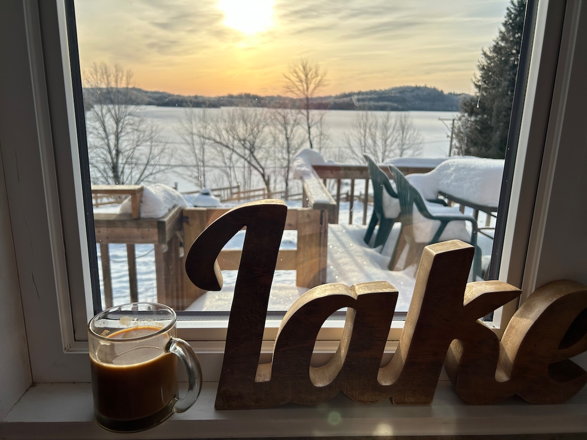 Cozy cottage on the hill overlooking the lake with a living space that offers a unique vibe with it's cathedral ceiling, fireplace, and floor to ceiling windows. Newly renovated bathroom. The two bedrooms accommodate 4 guests comfortably. We have high-speed wireless internet, satellite and Roku TV. All essentials supplied. Hiking, bicycle, ATV and sled trails along with ski hills are all within short driving distance. Your dog is welcome here! Winter tires needed on snowy days.