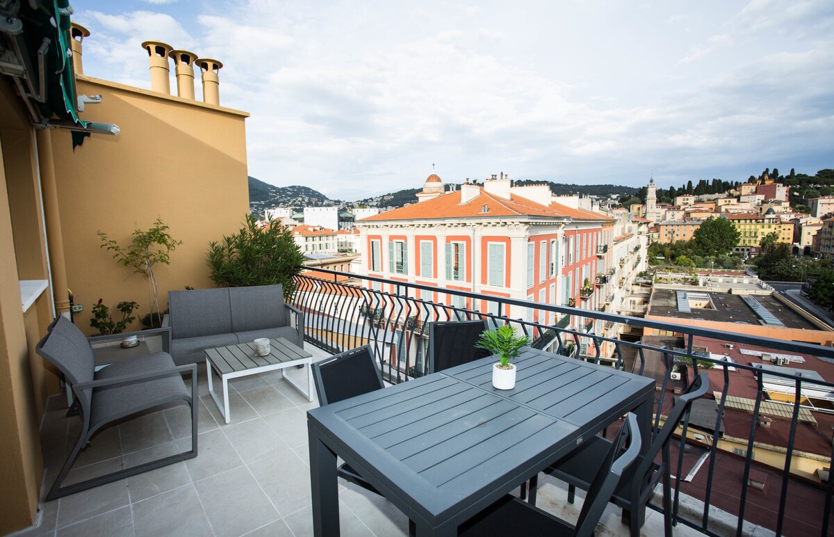 Haz que tu estancia en Niza sea memorable y sin complicaciones. Este lujoso apartamento recién renovado en el centro de Niza se encuentra a poca distancia a pie del centro de la ciudad, el casco antiguo de Niza y el Palais des Congrès. Disfruta de tus cócteles nocturnos escuchando las campanas de la iglesia mientras disfrutas de la espaciosa terraza del quinto piso con vistas a los tejados de Niza con las montañas a lo lejos. Lee a continuación para obtener más detalles encantadores.