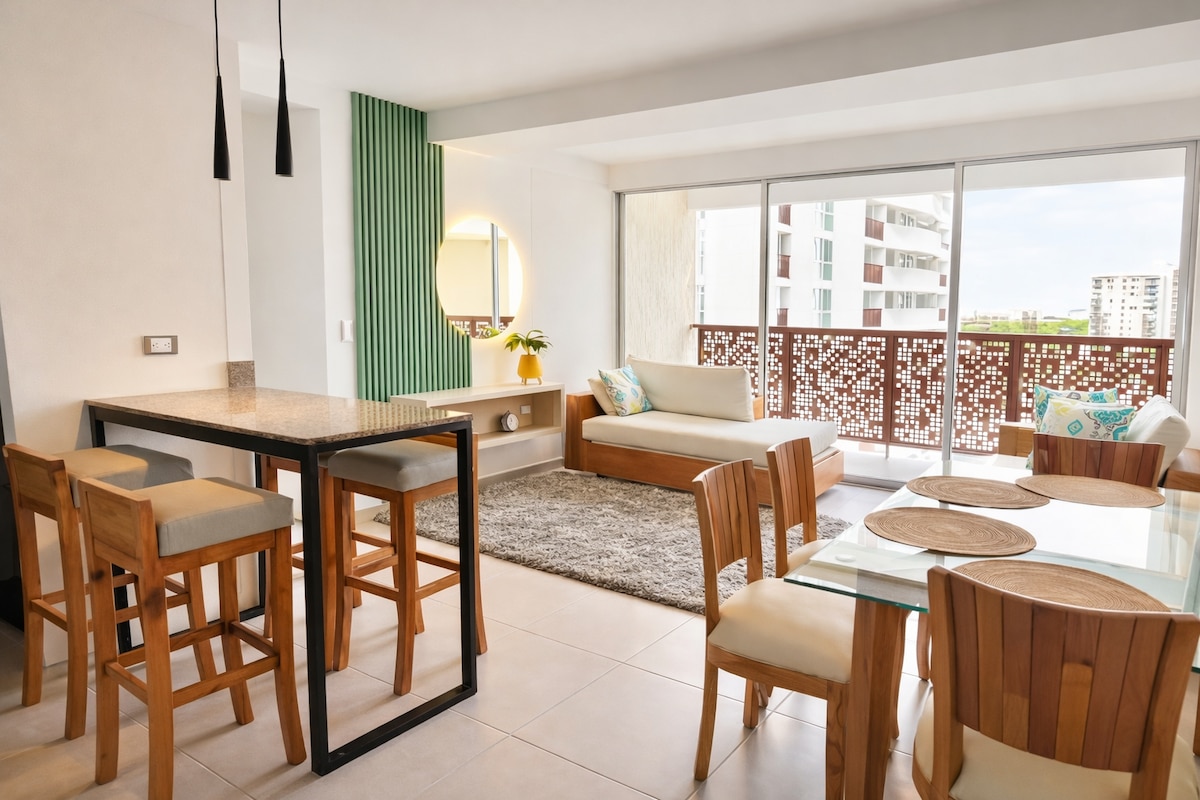 Apto para descanso con piscina y clima perfecto.