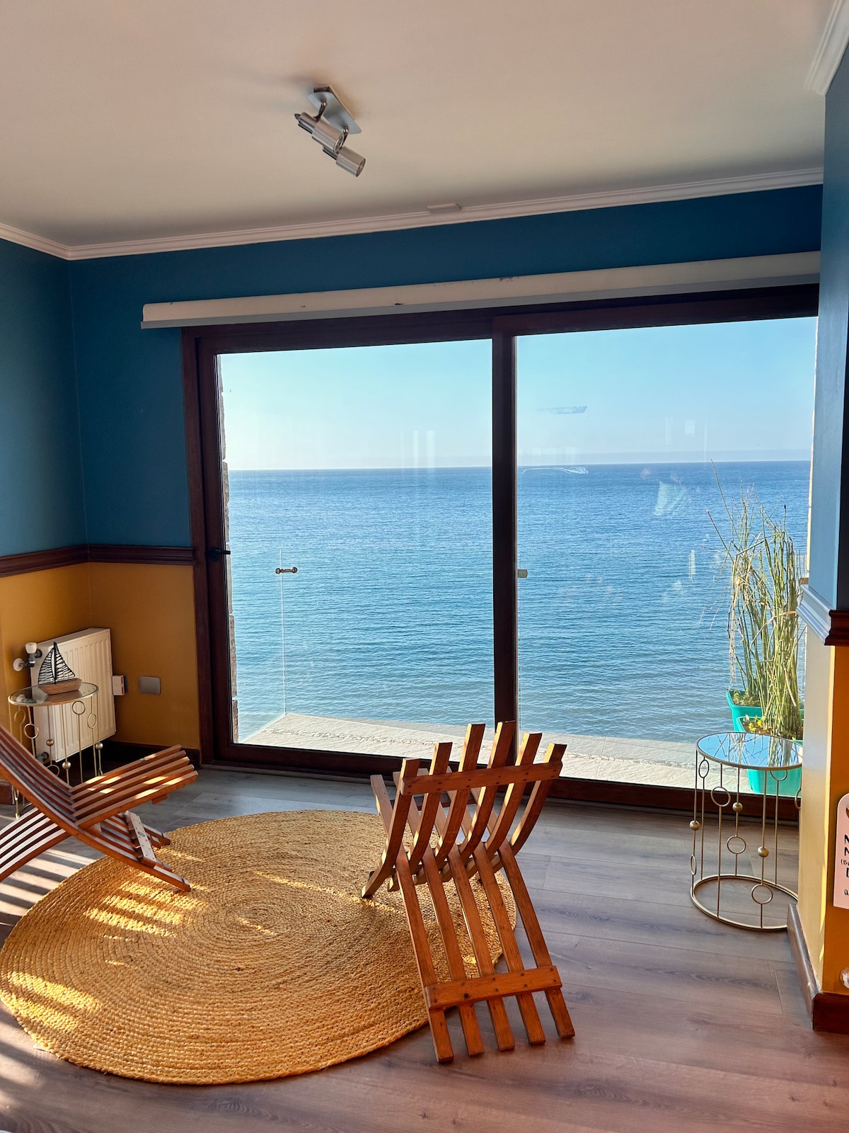 Una habitación luminosa con ventales que ofrecen una vista espectacular al mar. En el centro, un jacuzzi moderno invita a relajarse mientras se disfruta del paisaje. La decoración minimalista y cálida, con tonos neutros y relajantes. Lahabitacion incluye; piscina, cama king, desayuno continental, frigobar, calefacción, smart tv, wifi, cable, estacionamiento. El ambiente tranquilo y cómodo, acompañado del sonido de las olas, crea el refugio perfecto para descansar y disfrutar del entorno.