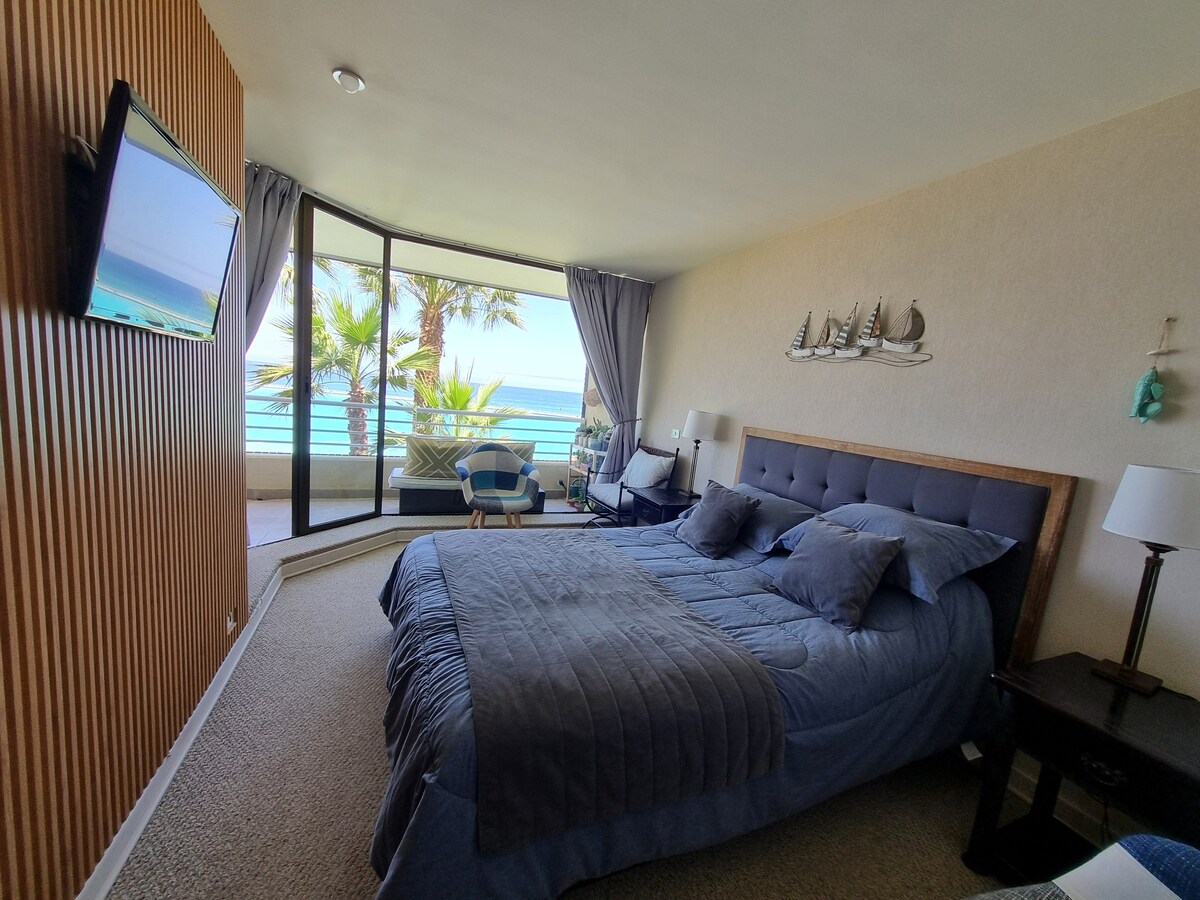 Lindo y acogedor depto frente al mar, ubicado en primera linea de Reñaca, totalmente equipado para 2personas, cuenta con todo lo necesario para su estadía, EstacionamientoPrivadoYseguro, DormitorioEnSuite,LivingComedorConFuton,TerrazaFrenteMar,Wifi, TVcable,ParrillaEléctrica,Binoculares,RestoBarExclusivoEdificioExcelente relación precio calidad. Depto ideal para teletrabajar y relajarse frente al mar, buena conexión wifi. !CuentaConPiscinaTemperadaJacuzziRestobarTodoLoQueNecesitasEnUnSoloLugar!