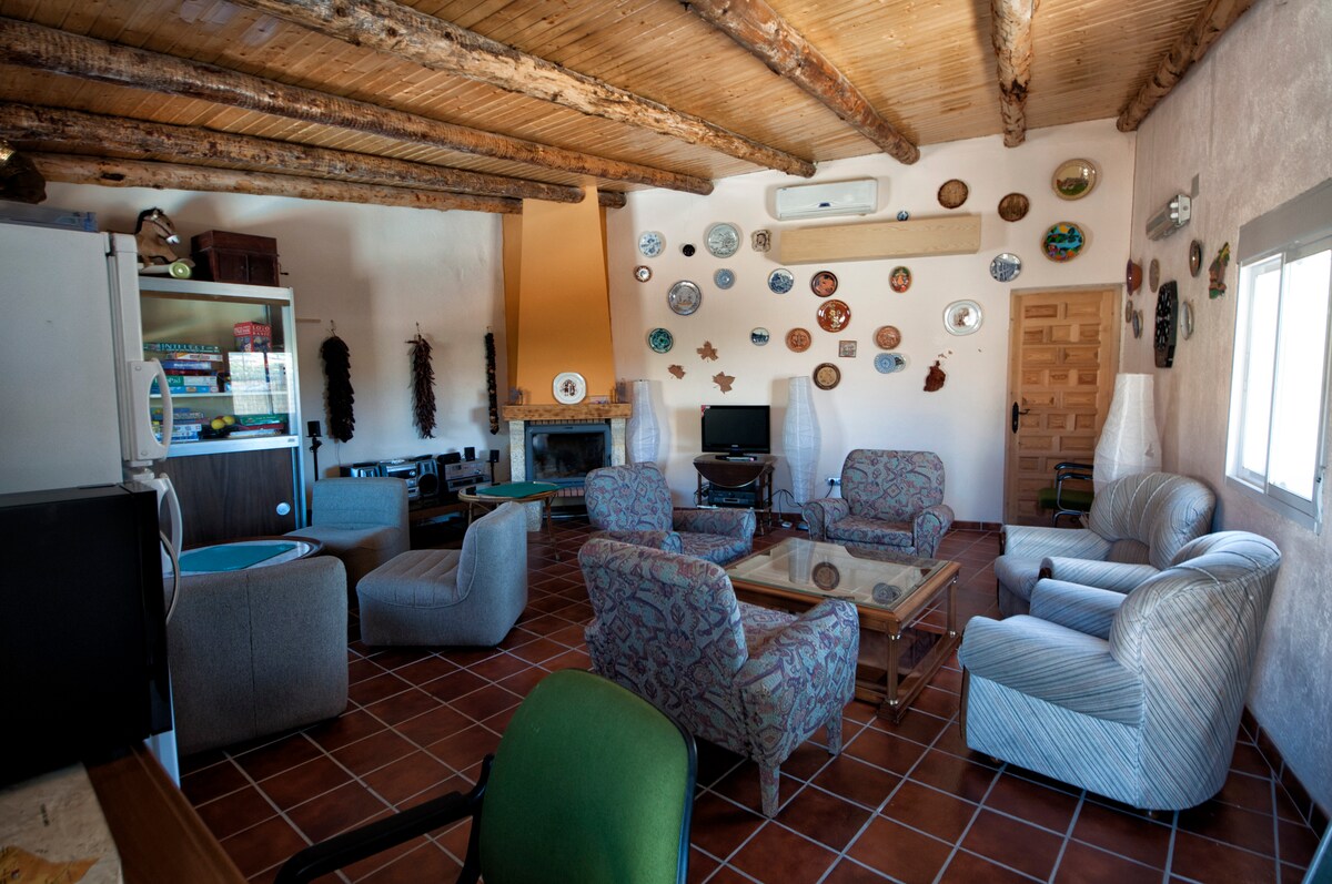 Casa cueva rehabilitada con mucho encanto, excavada en la montaña tras el castillo. Cálida en invierno y fresca en verano. Cocina equipada y barbacoa exterior en un patio privado con velador, mesas y sillas. Salón muy acogedor, con mesa comedor, TV, librería y estufa de pellets, calentando toda la casa. Además, hay radiadores eléctricos, ventiladores y climatizador portátil en verano. Dos habitaciones en la planta superior, con una terraza con fabulosas vistas desde lo alto del pueblo.