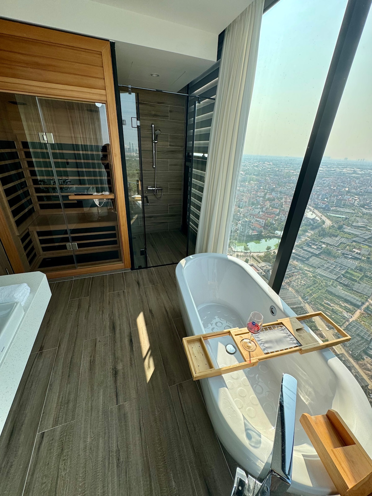Relájate en este acogedor y lujoso apartamento Ecopark con bañera privada, sauna privada y minibar de cortesía. La cocina incluye freidora de aire, microondas, cocina completa, incluidos utensilios de cocina y sistema de agua filtrada, además de lavadora y secadora. El gimnasio, la piscina y el acceso al onsen gratuitos te esperan en un entorno verde y exuberante. A solo 20 minutos del casco antiguo de Hanói con servicio de autobús por hora. Los huéspedes mensuales disfrutan de beneficios adicionales de cortesía para obtener aún más valor.