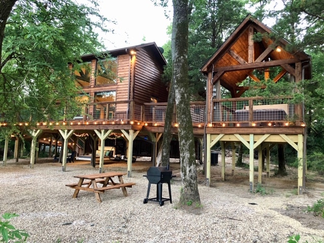 Gorgeous treehouse escape nestled in the tree tops of Garden Valley, Tx. The perfect place for a honeymoon, anniversary or surprise romantic getaway! All the joy and imagination of a treehouse combined with elegance, modernized to help adults relax and reconnect. Enjoy coffee in the trees on the balcony, wine and cheese with a sunset view, indoor/outdoor shower. Fully stocked kitchen and outdoor hibachi grill for those who love to cook, great local restaurants for those who don’t.