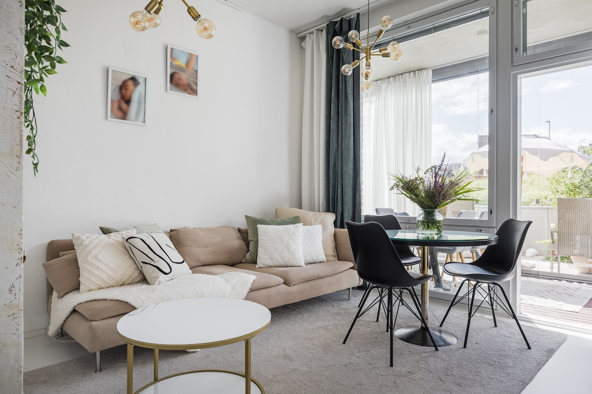 ¡Un hermoso apartamento de 2 habitaciones con patio propio en una excelente ubicación! A 5 minutos a pie de la estación de tren más cercana, a 7 minutos en tren del aeropuerto y a 30 minutos en tren del centro de la ciudad de Helsinki. A poca distancia a pie de tiendas de comestibles, restaurantes, gimnasios y todos los servicios necesarios para el día a día. ¡También hay un aparcamiento asequible! Perfecto para familias con niños pequeños, por ejemplo, una cuna de viaje, una silla alta, un cambiador y un orinal disponibles a petición. 2 camas individuales y un sofá cama, que se abre a 130*200 cm.