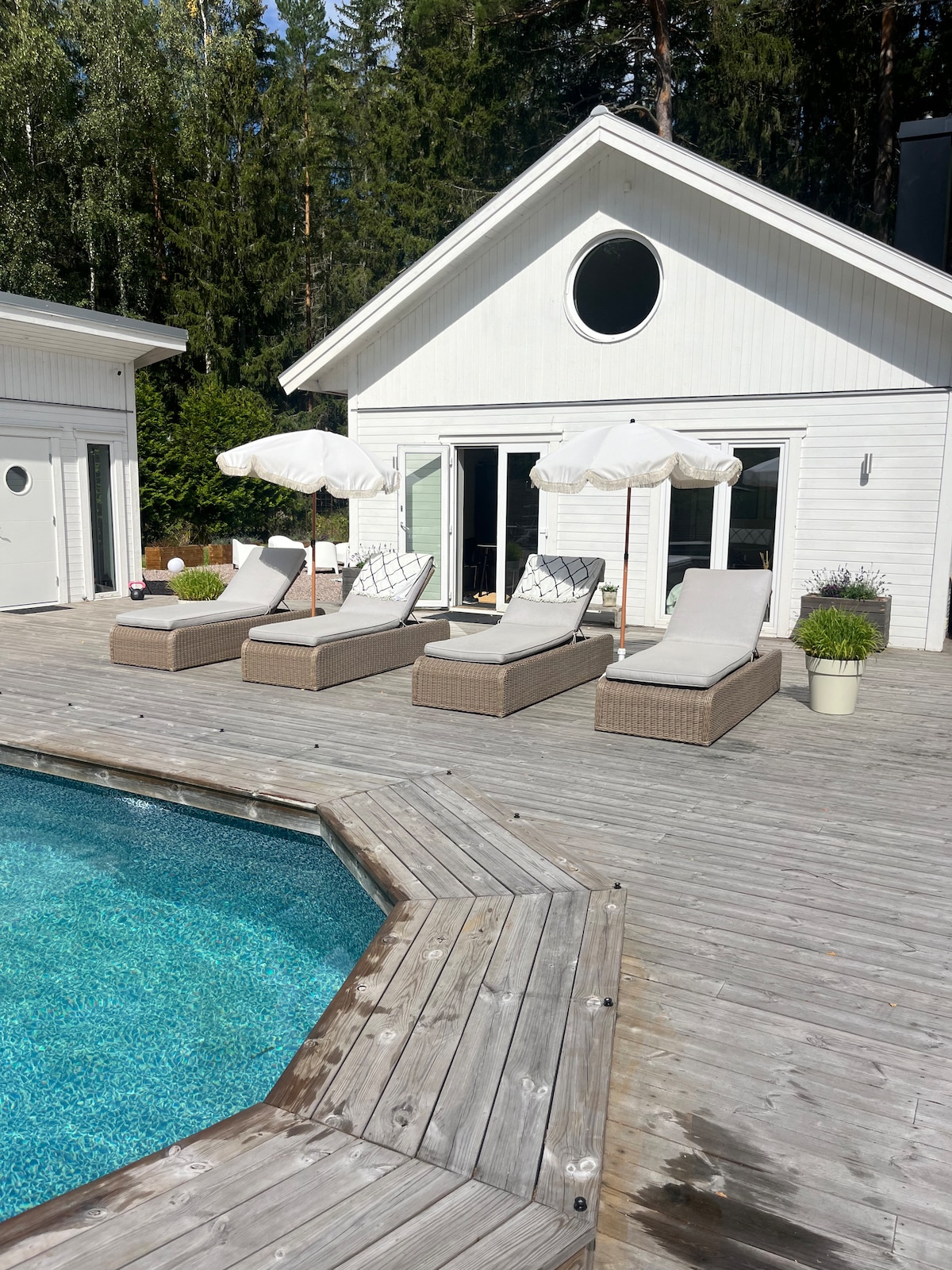 Stugor med pool, bastu och nära stan och natur.