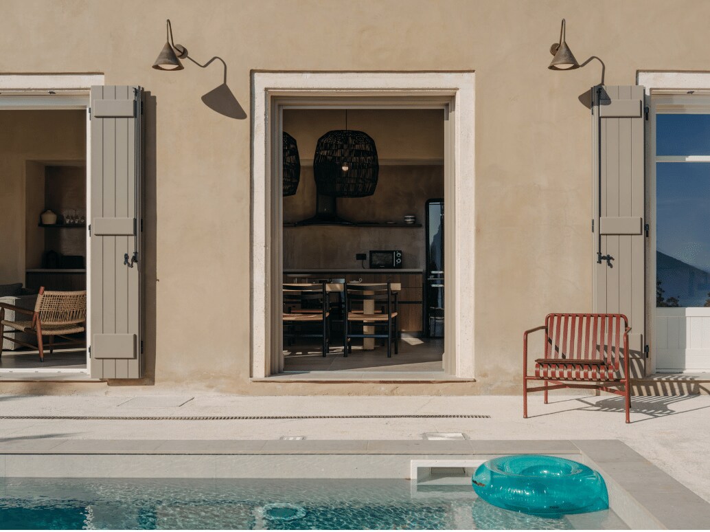 Situadas en casi un acre de exuberante vegetación con vistas al mar, F Topia Villas se encuentran alrededor de un antiguo círculo de trilla, ofreciendo a los huéspedes una experiencia inmersiva de un barrio griego. Las paredes de yeso marrón terroso, los techos de tejas beige y las ventanas de estilo francés se encuentran con las líneas mínimas del diseño arquitectónico, creando un paisaje cefalónico clásico pero moderno.