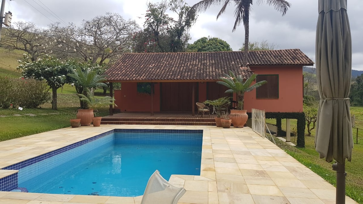 ¡Aire libre y puro, naturaleza con mucho verde! (Internet de fibra óptica de alta velocidad para su oficina en casa) Cómoda y equipada casa colonial. Hermosa casa de campo con toda la infraestructura y privacidad, para su fin de semana con la familia y los amigos. Contacto con la naturaleza y los animales, todo verde y florido en medio de un valle, con diversos frutos en el jardín. Piscina nivelada, sauna, barbacoa y estufa/horno de leña proporcionan una estancia más divertida.