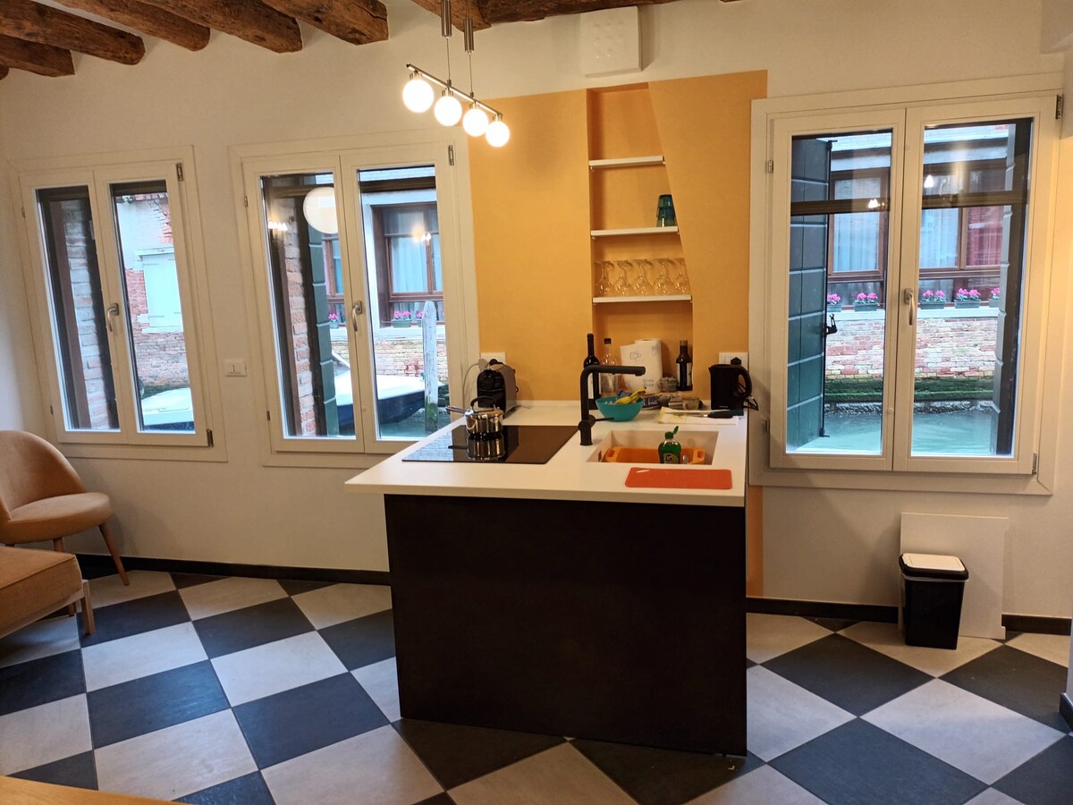 Un apartamento entero con una decoración de estilo veneciano, en un palacio privado del siglo XVII, con una VISTA IMPRESIONANTE. Situado en el primer piso, el apartamento tiene un dormitorio grande con una cama tamaño queen. El baño es espacioso y está equipado con una gran ducha. La cocina está totalmente equipada con nevera, tostadora, hervidor de agua y cafetera Nespresso. La entrada se abre a una sala de estar muy grande con vistas al canal donde puedes sentarte y básicamente tocar el agua mientras disfrutas de una copa de vino.
