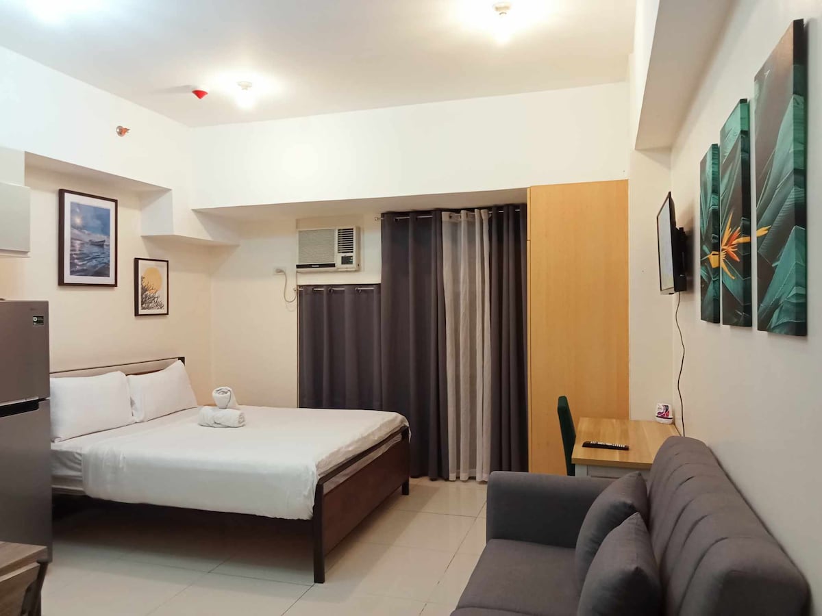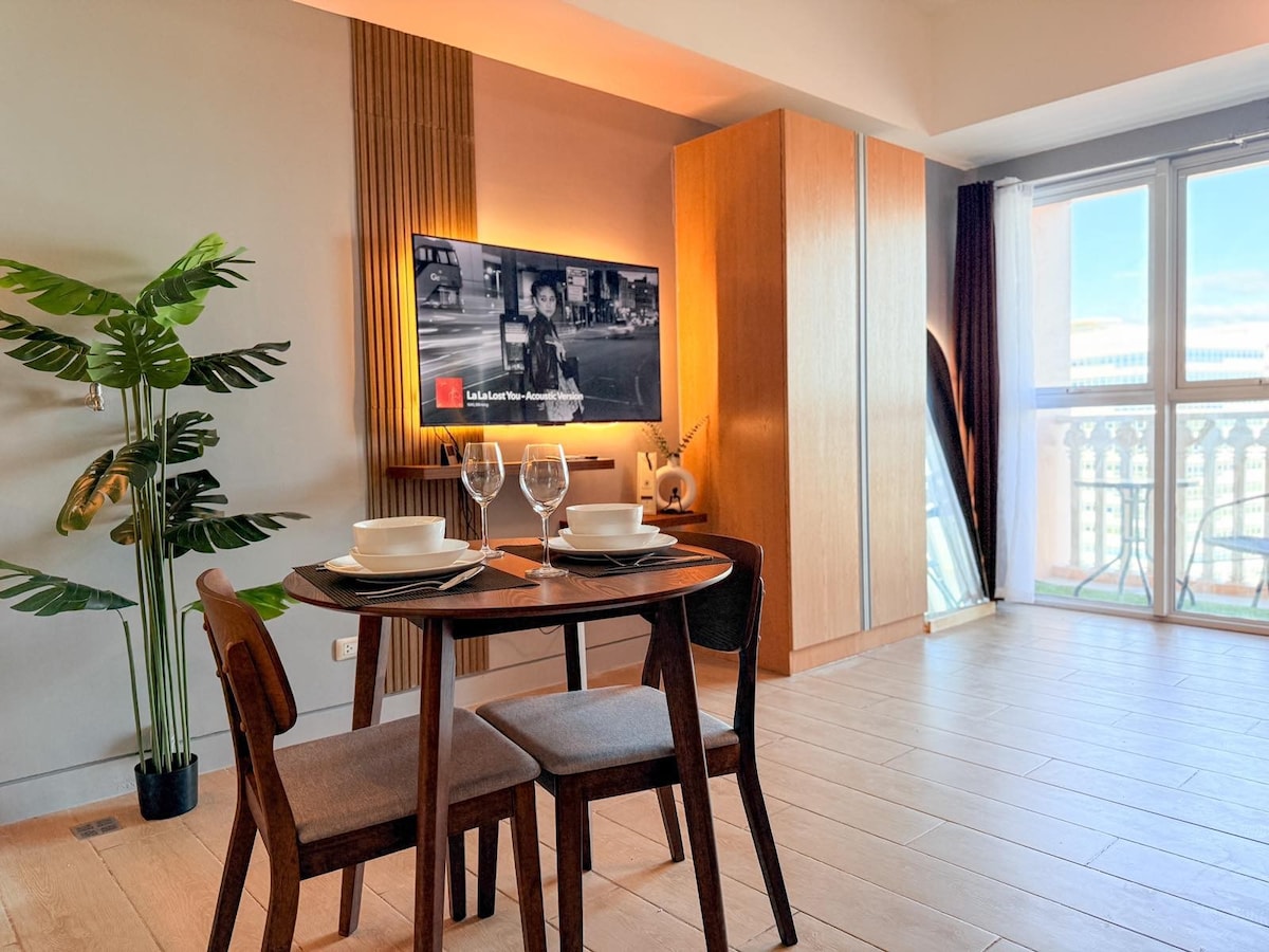 Vive, relájate y explora, justo al lado del icónico centro comercial Venice Grand Canal. Este acogedor estudio, situado en el piso 16, mide 41 metros cuadrados y cuenta con un balcón privado que ofrece una hermosa vista del jardín y el cielo, perfecto para tu café de la mañana o para relajarte por la noche. Comodidad a la vuelta de la esquina: LAWSON está al otro lado del edificio. A 2 minutos de Starbucks y otras cafeterías en el centro comercial. Cine en el centro comercial, juegos para niños y diversas opciones gastronómicas Además, a solo 10 minutos de Bonifacio Global City.