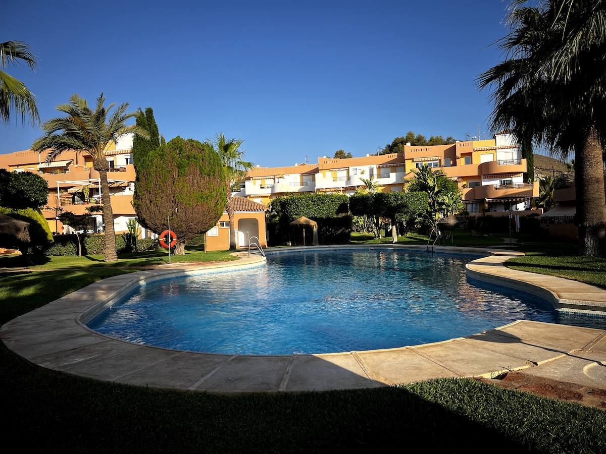 Residencial muy silencioso, con piscina y plaza de garaje, 2 habitaciones con cama de matrimonio, cuarto de baño con bañera y aseo con plato de ducha, cocina completa y salón comedor. Terraza con mesa y sillas, y lo mejor para el final... una terraza solárium, con zona chill-out, hamacas y pergola! Para pasar unos atardeceres inolvidables... Un apartamento con gusto y todos los detalles, cerca de la playa y chiringuitos. Pueblos turísticos a 4 min ,calas y playas virgenes cercanas