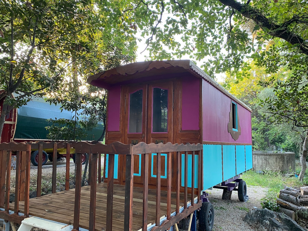Encantadora caravana tipo gitana con zona de jacuzzi (con suplemento fuera de julio agosto*). Ideal para dos personas, pero posibilidad de alojar a dos niños menores de 12 años debajo de la cama principal**: - 2 camas de 140x190 - 1 cuna bajo petición * Fuera de julio y agosto, suplemento en el lugar de 20€ por agua y calefacción del jacuzzi ** suplemento en el lugar de 20€ por persona adicional más allá de 2.