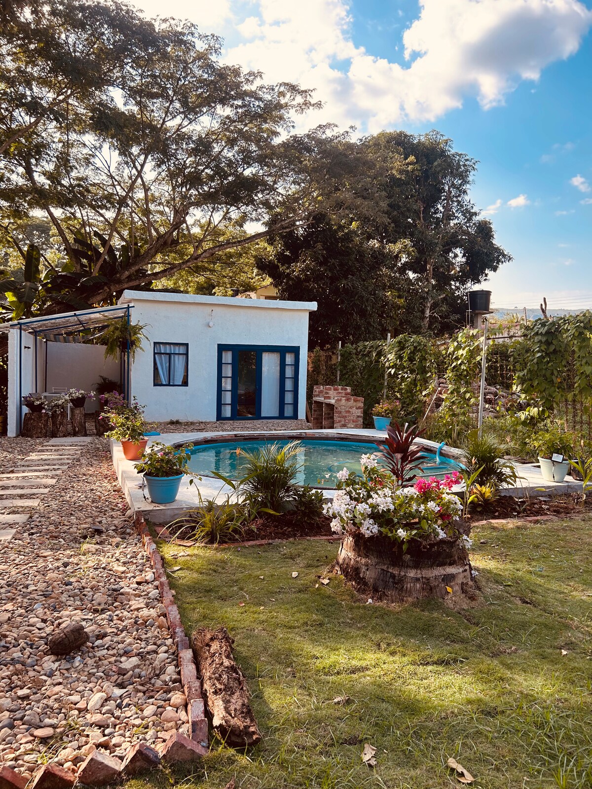 Con internet de alta velocidad. La Bohéme Azul: una minicasa entre flores, tonos azul cielo y amarillo pastel donde el tiempo pasa lento. Disfruta la piscina privada, el comedor al aire libre y las noches con aroma a campo. El agua viene de una quebrada natural y tus perritos tienen su propio prado. Perfecta para desconectarte, leer o compartir con quien amas. A 30 min de Melgar y Girardot, cerca de Piscilago. Una casa de IG@Lepremierrevecarmendeapicala