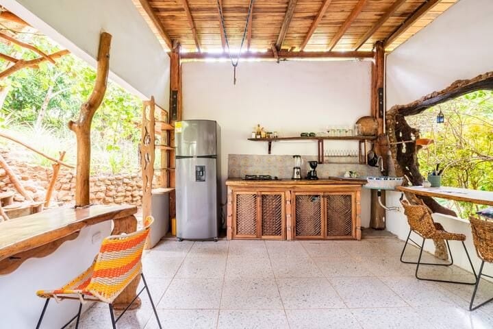 Jungle Casa privada para 1 a 3 personas, elevada sobre la selva, ámplia terraza en el segundo piso y vista al MAR. Estamos a 2 min en moto del Parque Tayrona (Zaino). Zona muy tranquila, lejos del ruido de la vía, casa autosostenible pero cómoda, energía solar, fuera de la red, Wifi Starlink. Somos anfitriones en sitio y te ayudamos con tours, actividades, transporte, domicillios y secretos locales. Incluye libre acceso a las playas más cercanas y hermosas de la zona (11 min caminando).
