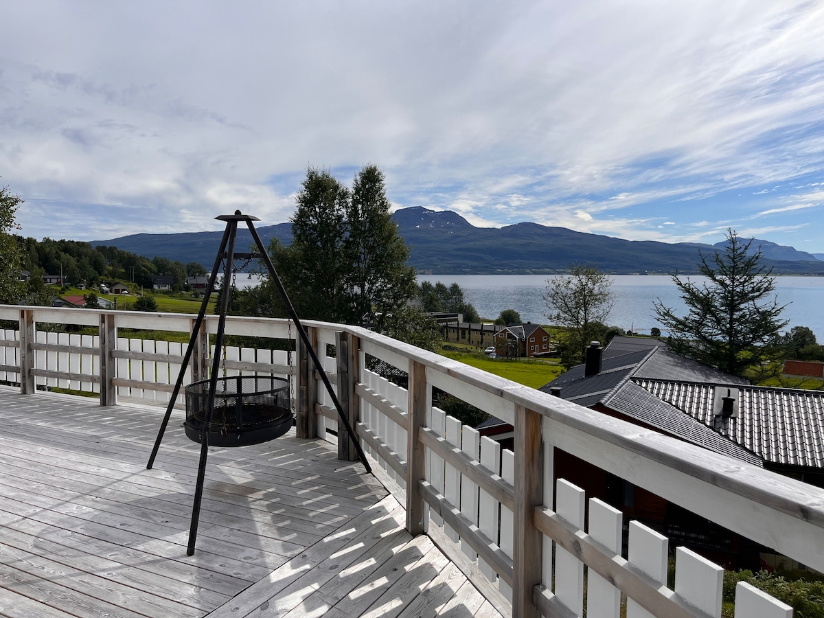Acogedora casa de vacaciones en la ladera con impresionantes vistas al mar (Bergsfjord), enormes ventanales en la sala de estar y un balcón, cerca de la carretera panorámica de Senja, tienda de comestibles Joker cerca (a 15 minutos a pie), ubicación perfecta para practicar senderismo, esquí, pesca, excursiones en barco y viajes en kayak. Sol de medianoche en verano (24 horas de luz) y posibilidad de ver la aurora boreal en invierno. Ferry cercano: Gryllefjord-Andenes (Vesterålen) y Botnhamn - Brensholmen (Sommarøya/Kvaløya) ¡Cálida bienvenida en Skaland!