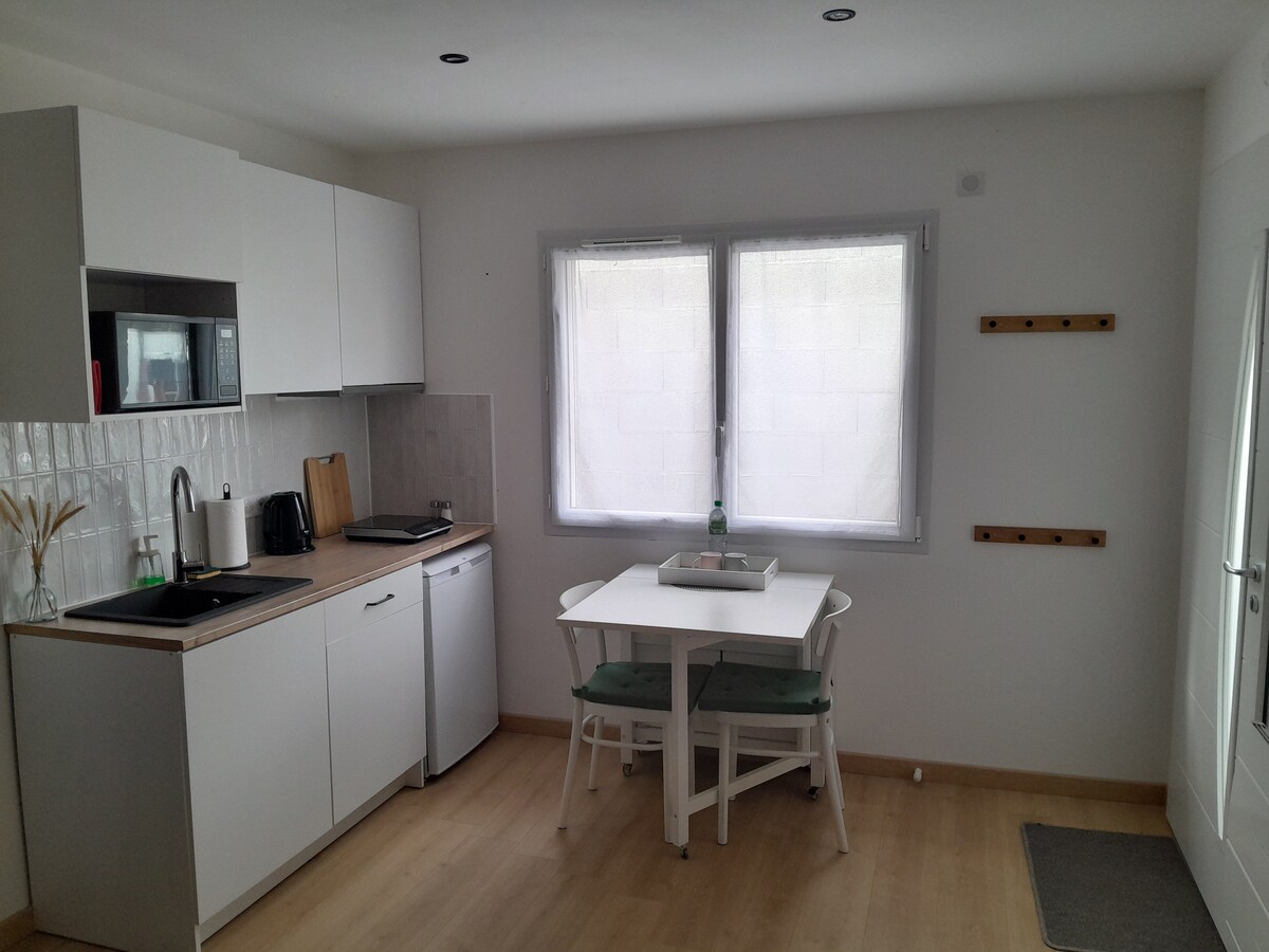 Charmante annexe indépendante de 35m², accessible de plain-pied, située à Vic Le Comte pouvant accueillir jusqu'à 4 personnes. Seul, en couple, ou en famille, nous vous accueillerons avec plaisir. Assimilable à un studio, l'annexe est composée d'une pièce et d'une salle de bain. Tout est au même niveau, cuisine, salon, coin chambre et salle de bain. Pour plus d'intimité, la chambre est séparée du salon par un rideau.