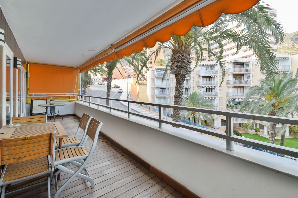 Estudio muy luminoso con impresionantes vistas, a 250 metros de la playa. Con vistas al mar y a la montaña. Balcón espectacular para el verano, se ve el amanecer y por las tardes da la sombra. Ideal para comer y cenar. Cuenta con todas las comodidades, cocina completa (con microondas, tostadora, placa de inducción, etc.), aire acondicionado con bomba de calor, lavadora, nevera, tv, mesa y sillas tanto dentro del estudio como en la terraza.
