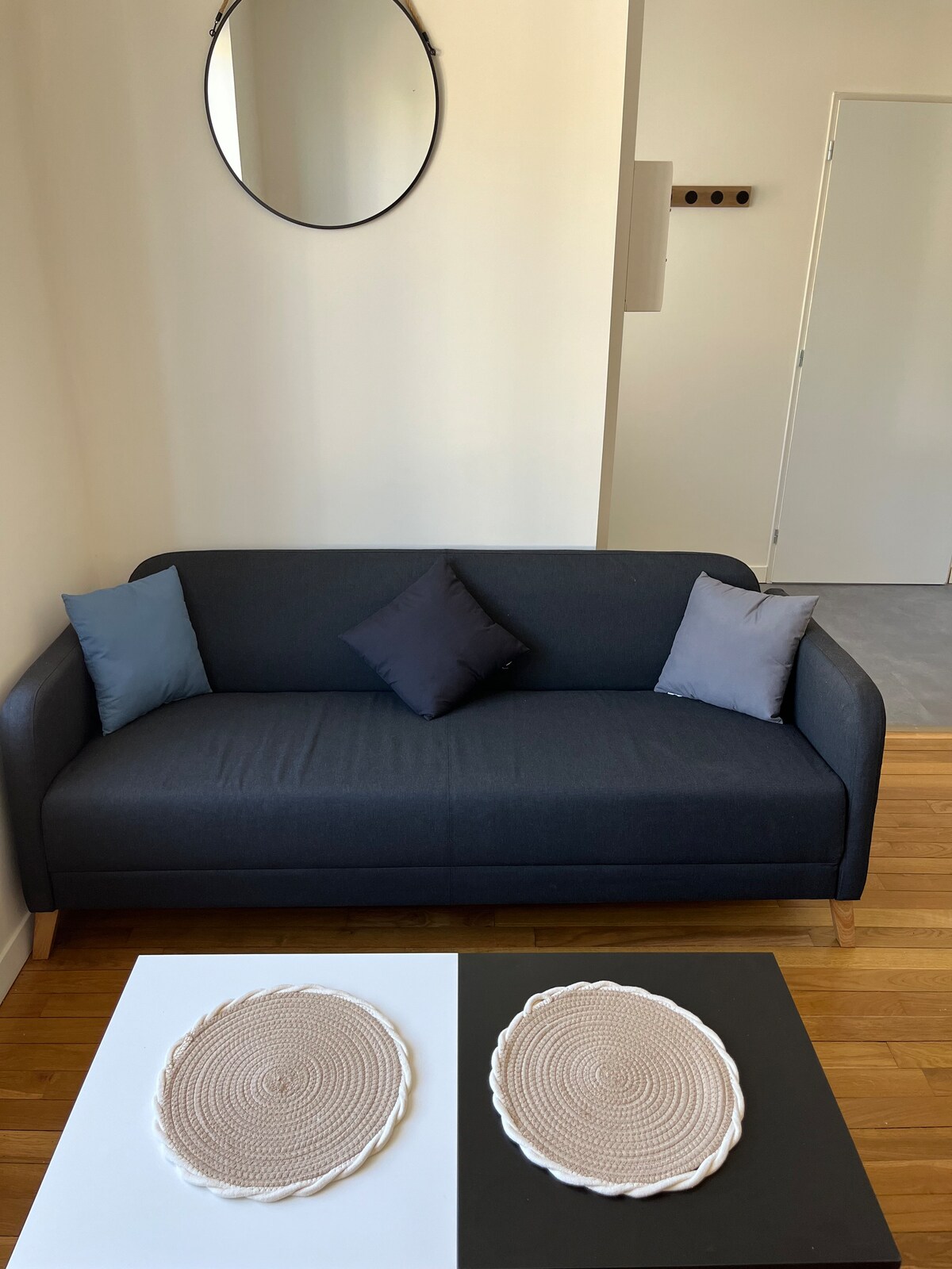 Apartamento de 25 m², con cama grande y sofá cama.