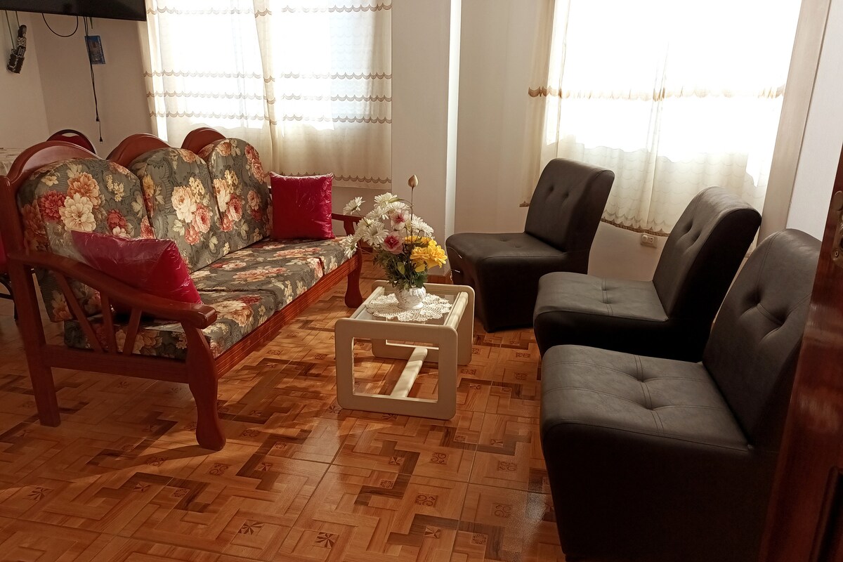 Mini Dpto. totalmente equipado, independiente, ubicado en el primer piso con 2 puertas, Una a la cochera y otra a la calle. El alojamiento es privado, confortable y práctico, con cocina, cama matrimonial para 2 personas, y un camarote con 2 camas, una sala con sofá cama, ubicado a 10 minutos de la ciudad de Trujillo, te conectamos con agencia de turismo de confianza que te pueden recoger de la casa, El lugar no es residencial pero muy cómodo.