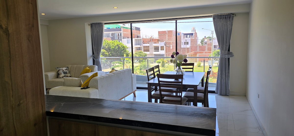 Pasa un momento agradable, comodo y relajado con toda la familia en este alojamiento con estilo, departamento de estreno, frente a parque, con equipamiento completamemte nuevo a 10 min del mall plaza, a 20 min del balneario de huanchaco, urbanización nueva y tranquila, cuenta con cochera para auto o camioneta de mediano tamaño (4.60 m), cuenta con instalación de agua fría y caliente, internet wifi de 1000 mbps y cable con más de 120 canales.