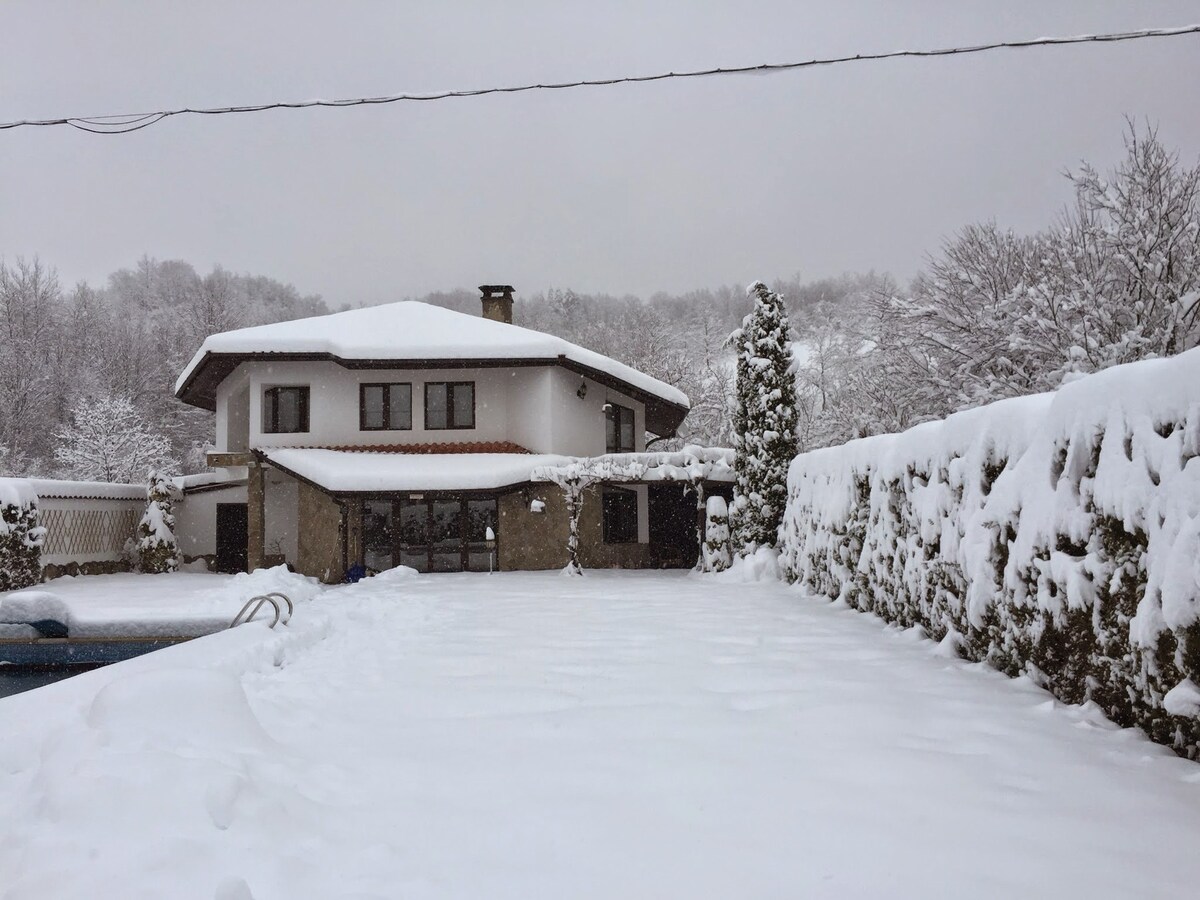 Villa Begria se encuentra en la ciudad de montaña de Apriltsi.Tiene una gran vista del pico más alto de las montañas balcánicas-Botev.Su capacidad es de 17 personas.Cada habitación tiene su propio baño,balcón, TV vía satélite y wi-fi.La villa ofrece una amplia zona de comedor con una chimenea de piedra y cocina totalmente equipada.La villa también ofrece una piscina infinita al aire libre y jacuzzi(solo en verano),sauna, barbacoa al aire libre, zona de estar al aire libre.Los huéspedes pueden utilizar una lavadora,secadora,plancha, secador de pelo, cunas de viaje, silla alta.