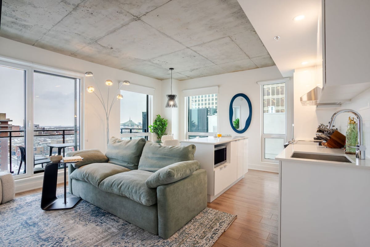 ¡Apartamento situado en pleno centro de la ciudad con acceso directo al Bell Center! Disfruta de tu estancia con lujo y comodidad en un apartamento de un dormitorio totalmente amueblado que incluye café, tostadora, hervidor de agua y todos los utensilios de cocina gratuitos. ¡Sauna, piscina, gimnasio con numerosas pesas y máquinas, salón panorámico, sala de juegos, salón y terraza con múltiples barbacoas a tu disposición! ¡Disfruta de un aparcamiento subterráneo gratuito y de un acceso a 1 minuto al sistema de metro sin tener que poner un pie fuera! Netflix incluido.